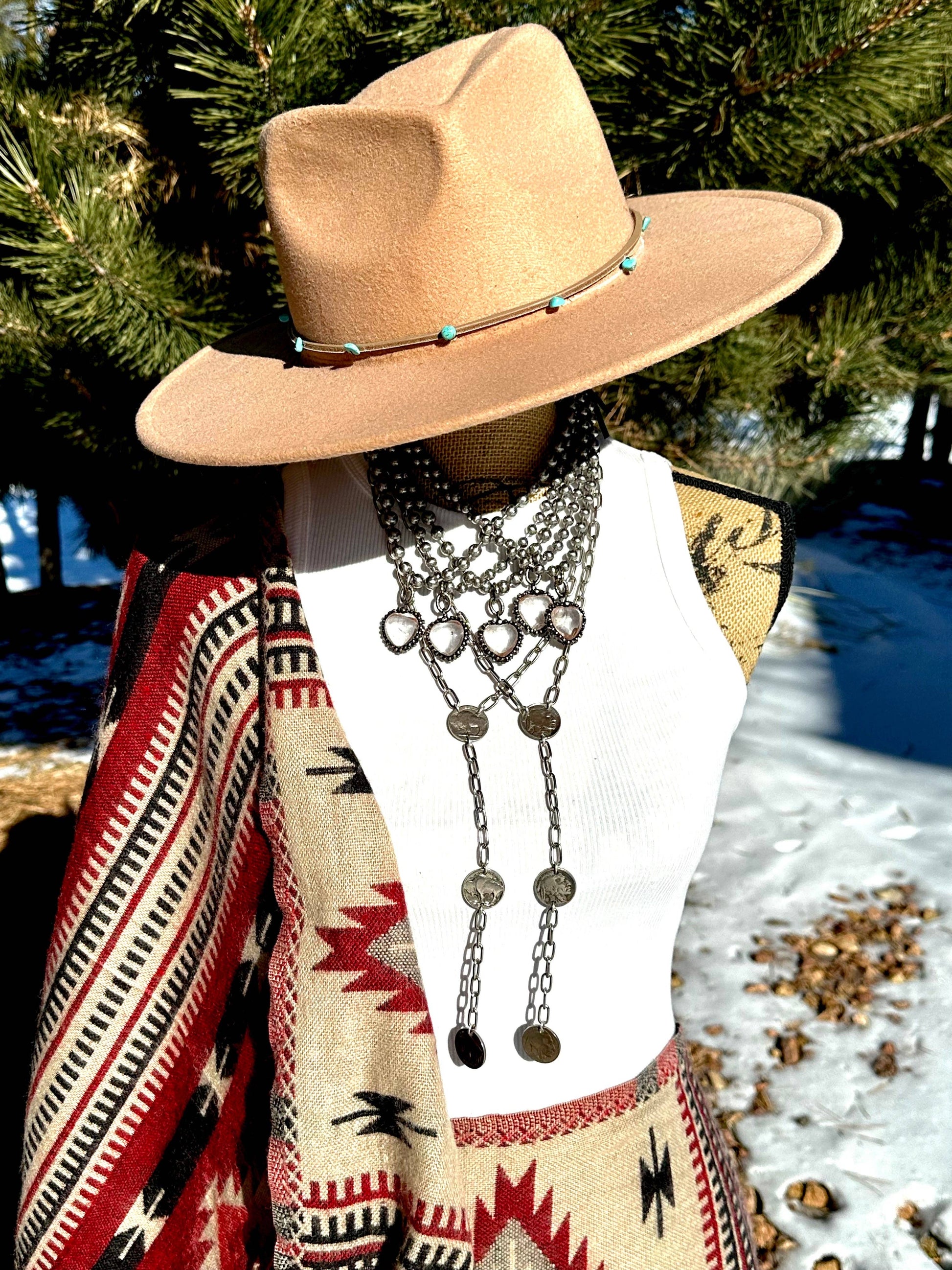 Length: This lariat measures 22 inches around the neck (adjustable), with a 7 inch drop...for a total length of 29 inches.