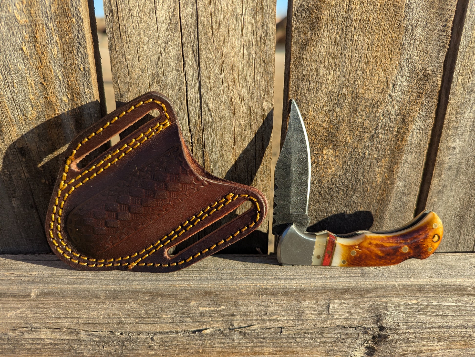 Burnt Bone with red and white resin. 6 5/8" let ng open. 3" Damascus Steel with locking blade. Comes with leather tilted sheath.