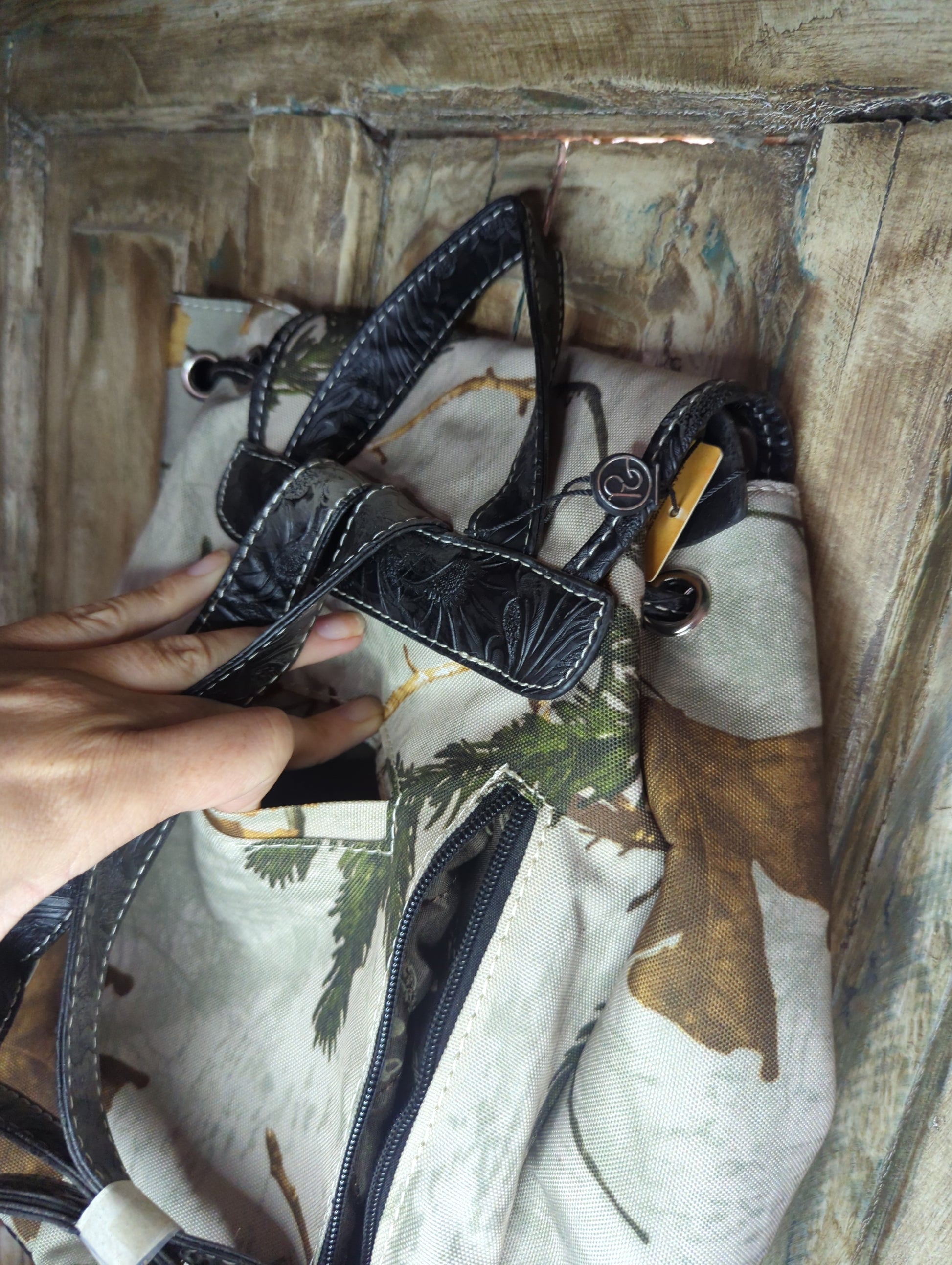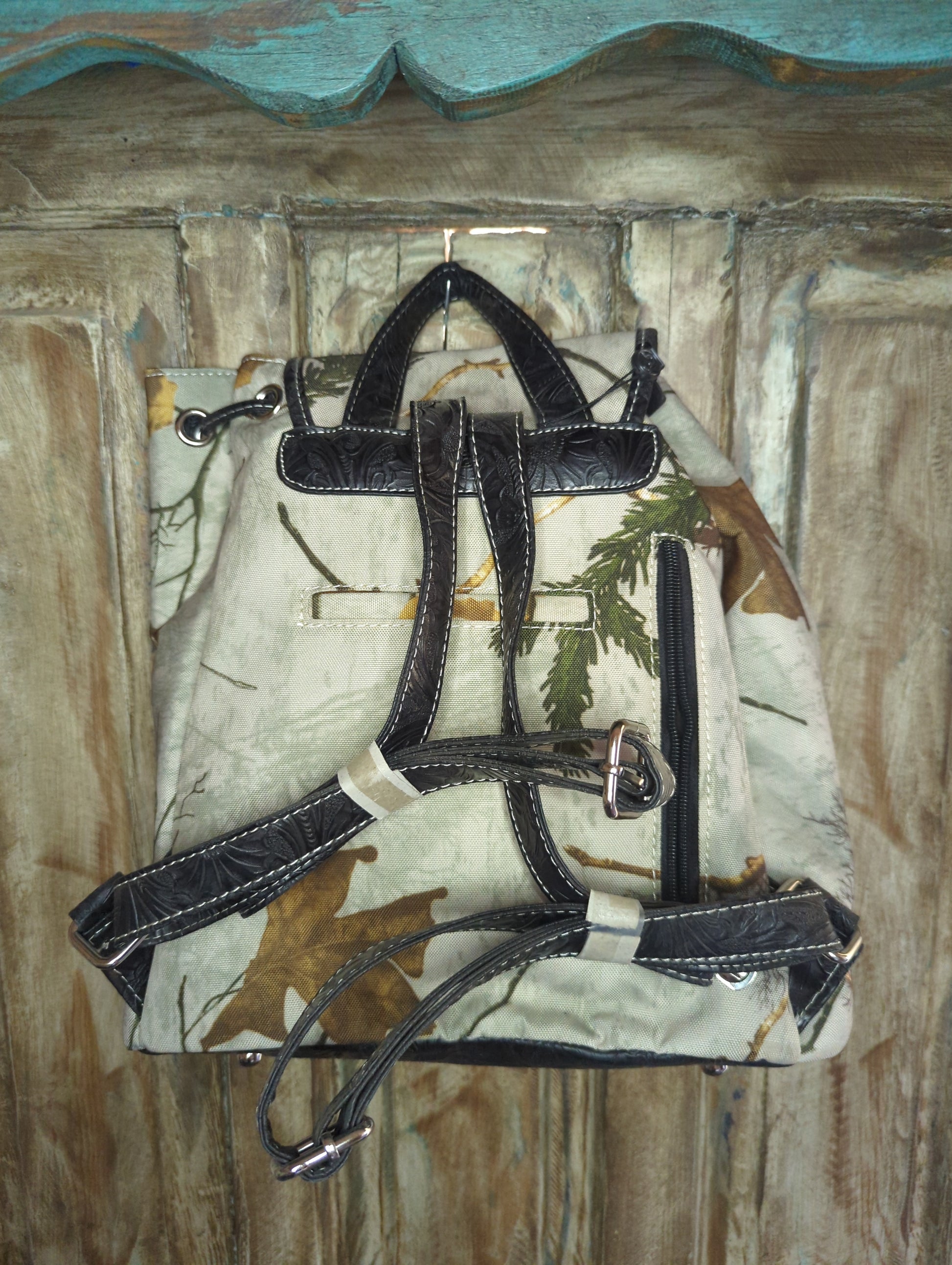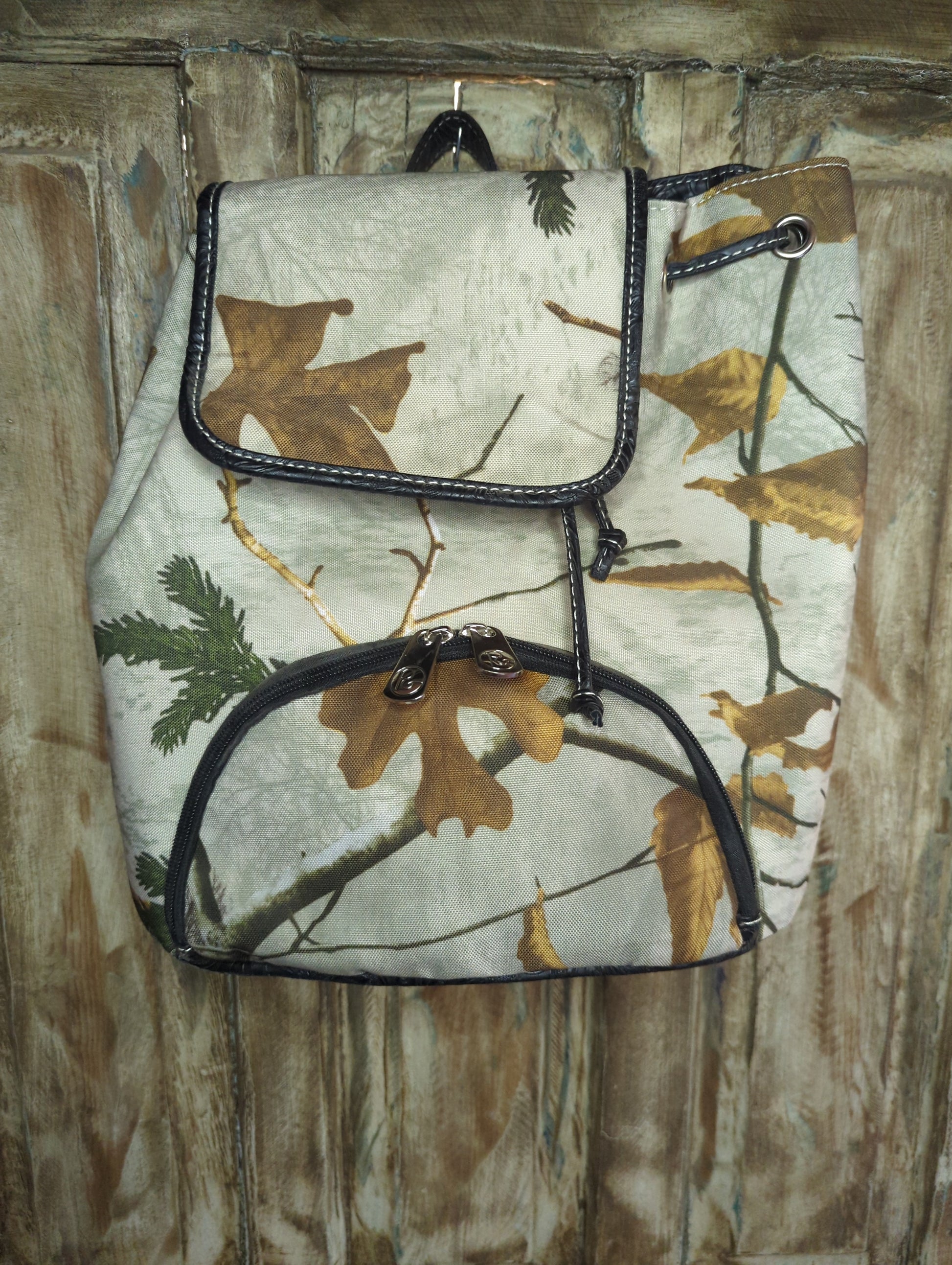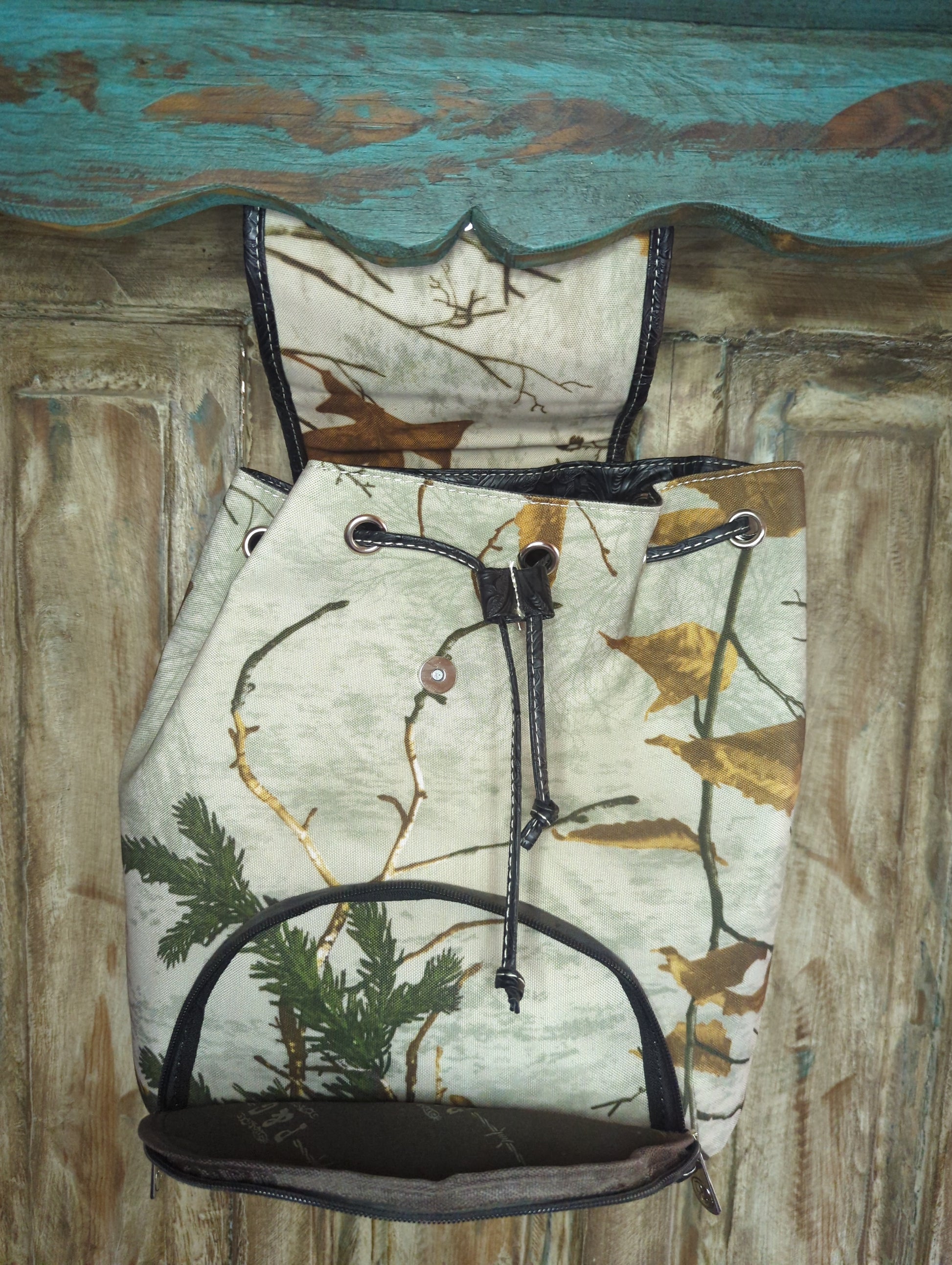 Canvas and faux embossed leather bag. Lightweight and durable. Top has a magnetic snap flap to cover the opening that is pulled closed with a drawstring. Multiple pouches and pockets inside. Front pocket has two zippers. Rear has a zip pocked(concealed carry pocket for small sized gun). Also has a small slit pocket for a phone or other small essentials. Shoulder straps are adjustable.