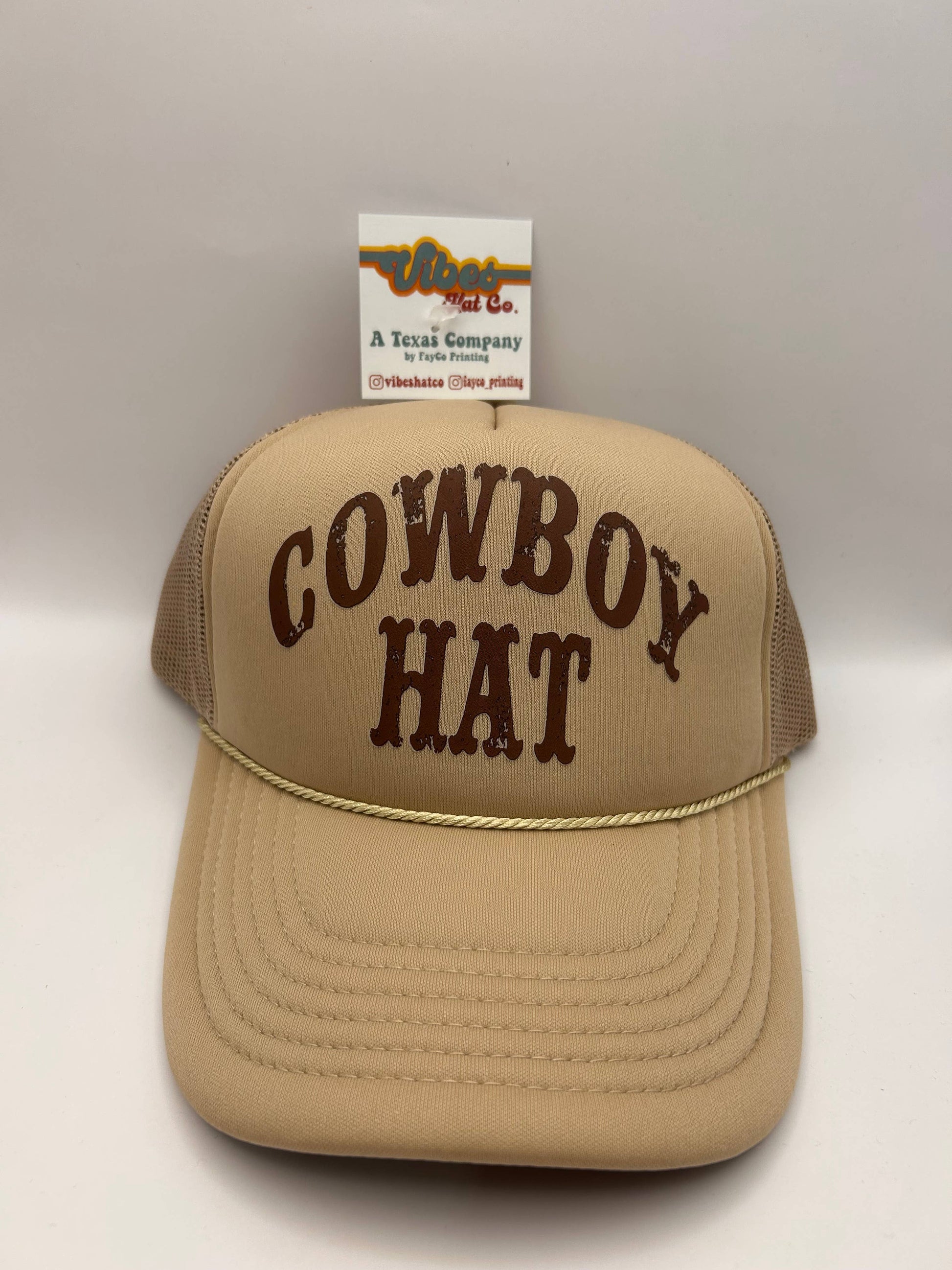 Brown printed Cowboy Hat design on your favorite foam trucker hat color! All trucker hats have a foam front with a mesh back and an adjustable snapback enclosure. Pair with a trucker hat chain for the perfect combination.