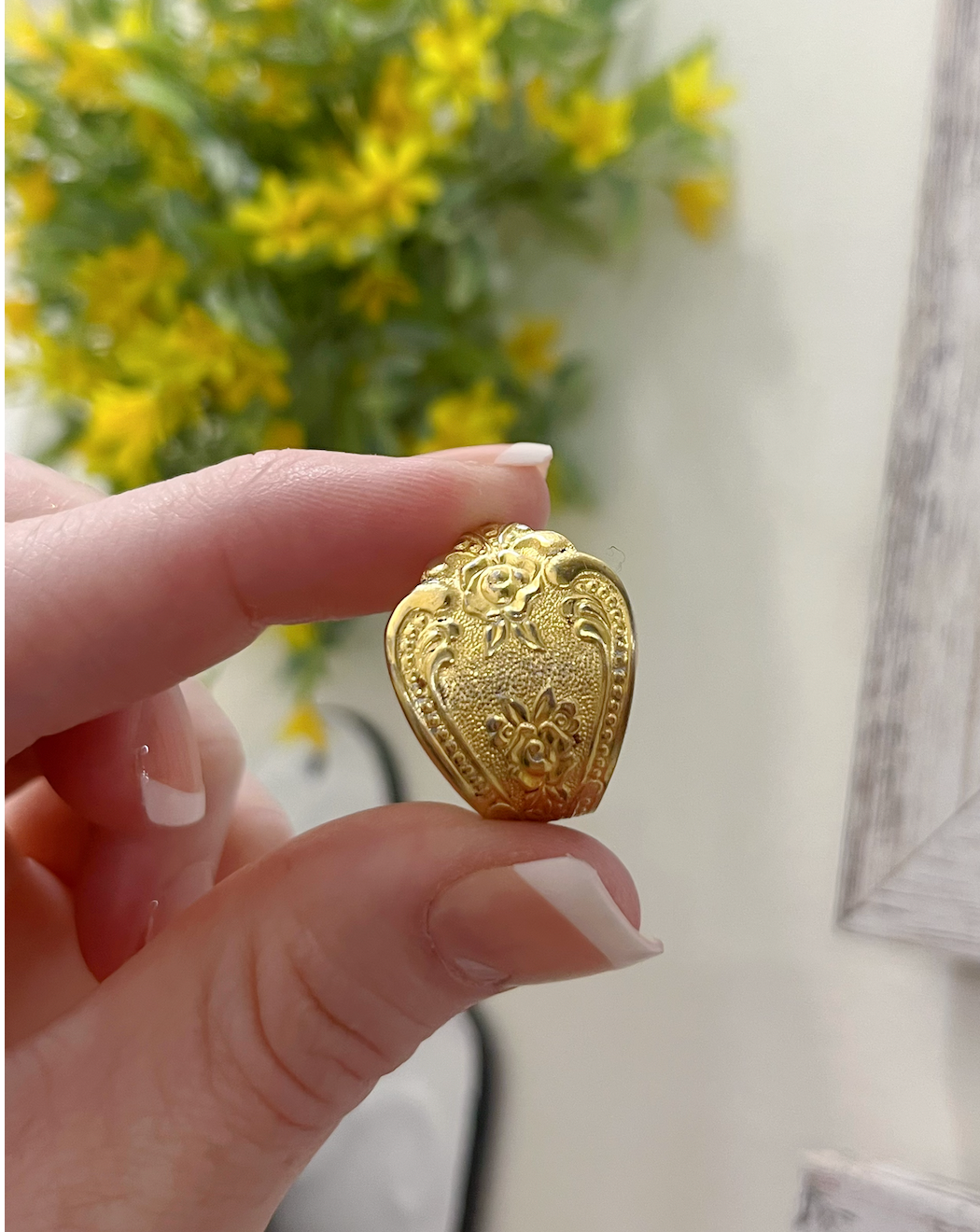 This romantic ring is blooming with vintage charm. Made from a floral-patterned spoon and shaped into an adjustable wrap, this golden brass piece feels like heirloom jewelry—without the heirloom price.