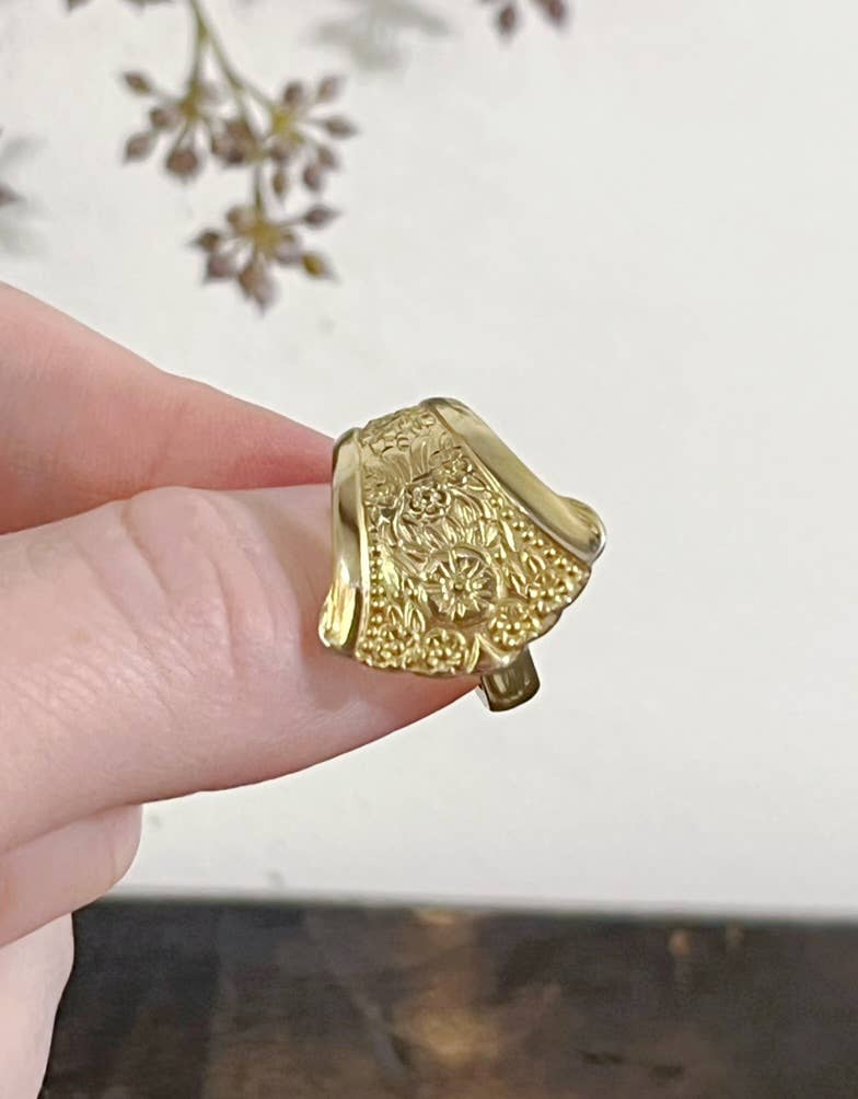 The Golden Thicket ring is a floral daydream. Rich with embossed detail and gold-plated shine, it’s handcrafted from vintage silverware and shaped into a sturdy, non-adjustable band. Each one carries a little bit of mystery and a whole lot of charm.