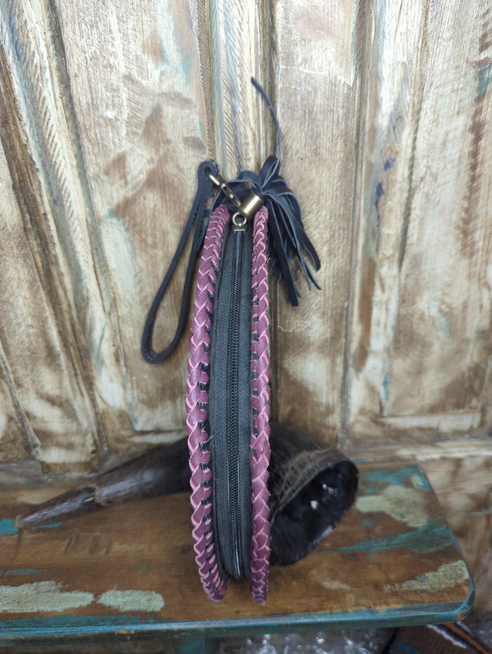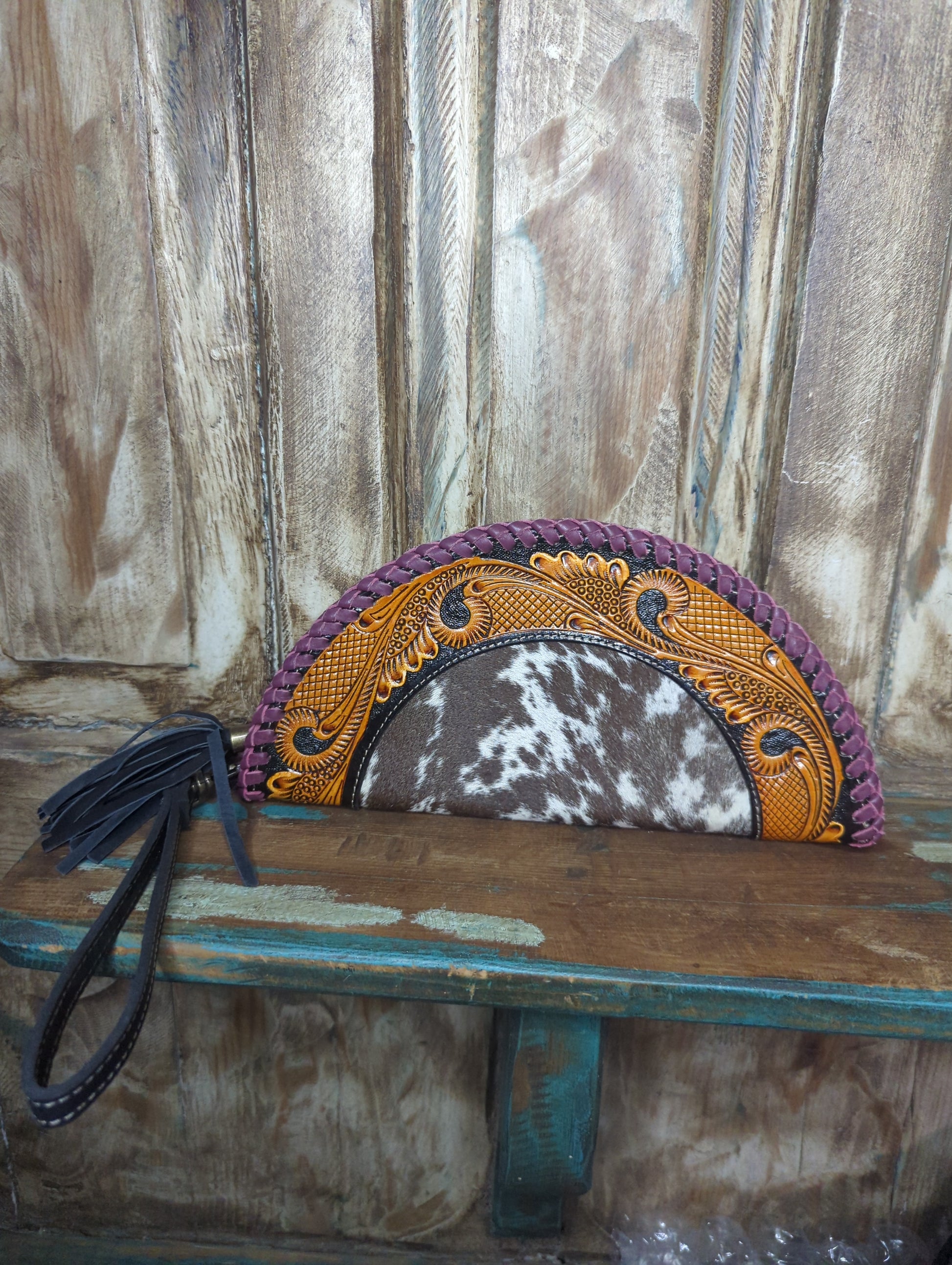 We're IN LOVE with this style! Tooled leather, cowhide, and soft whip stitch edges make her the perfect accent that's easy to carry, yet makes a BIG statement. Comes with a removable comfort wristlet strap so you don't drop her, and the zipper has a black fringe tassel. Open her up to a two sided compartment(cards on one side/Zipper pouch on the other) and a zip top coin purse down the middle. She's perfect for any night out!