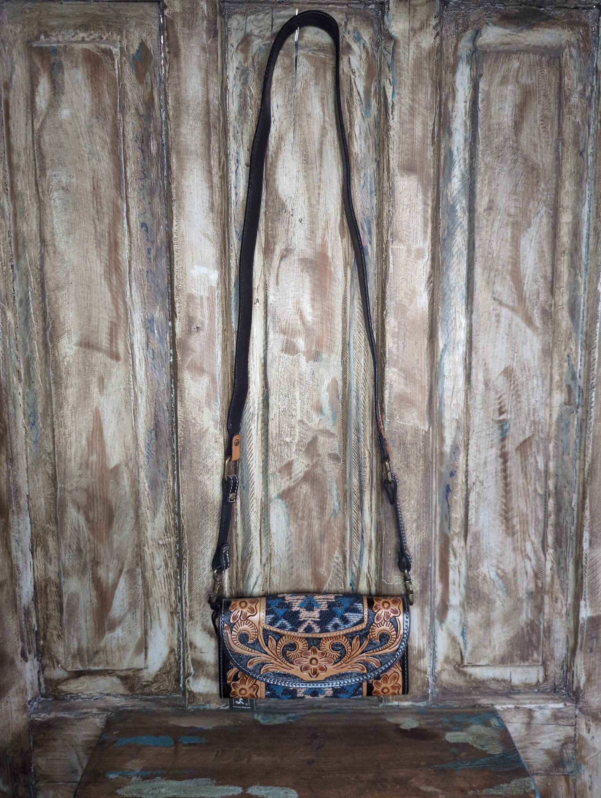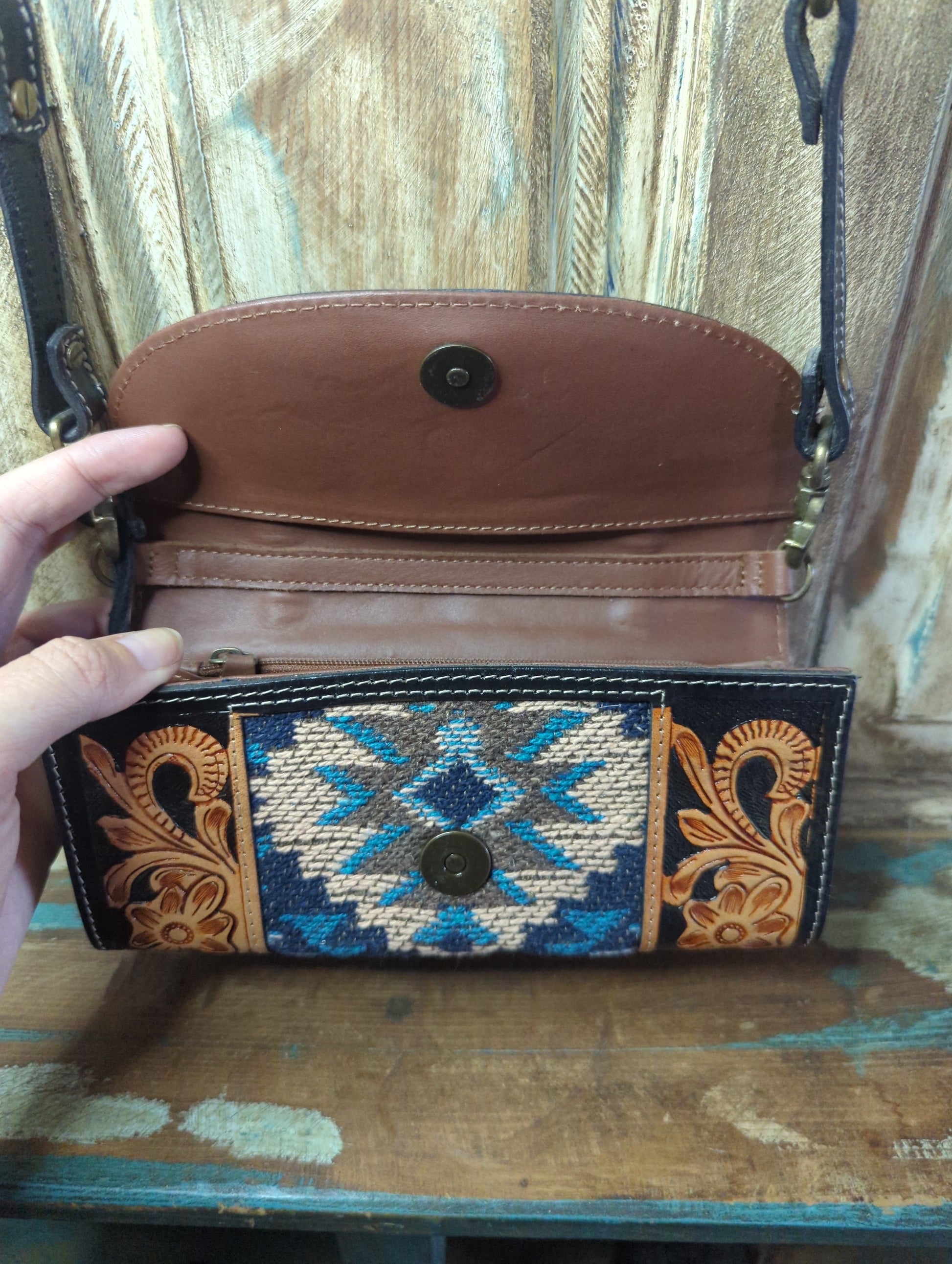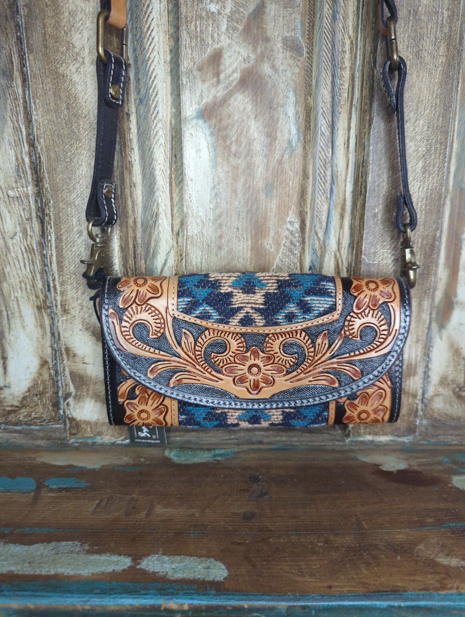 Tooled Leather and Cotton wallet/purse with tooled leather strap. This cute purse opens up to three compartments that include a bill slot, card holders, and a zip top coin pocket. It closes with a flap that is held by a magnetic snap.
