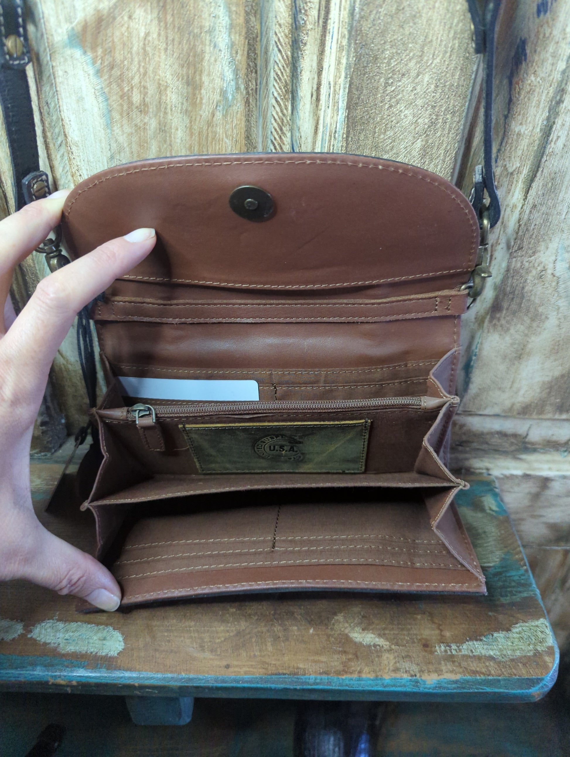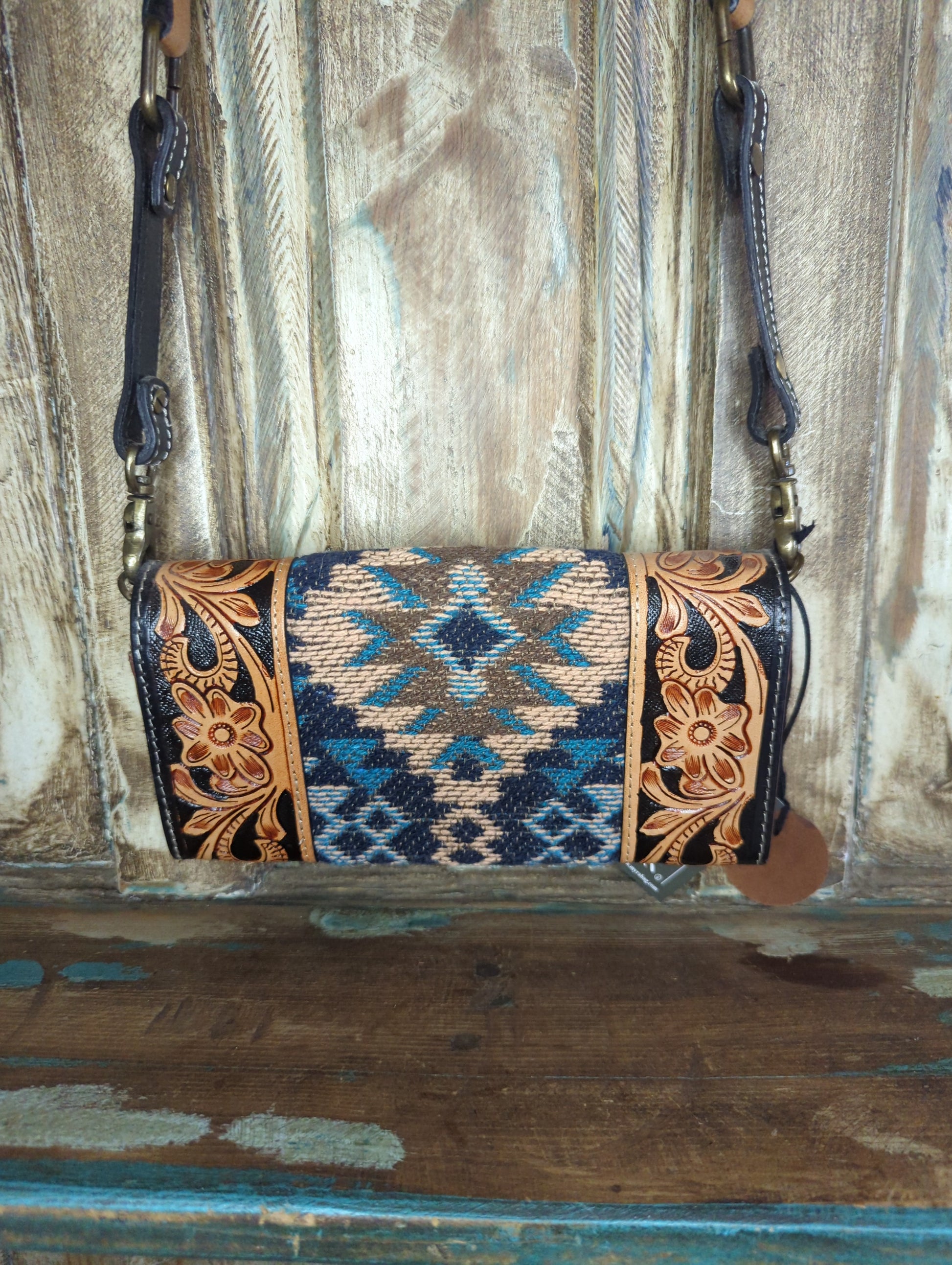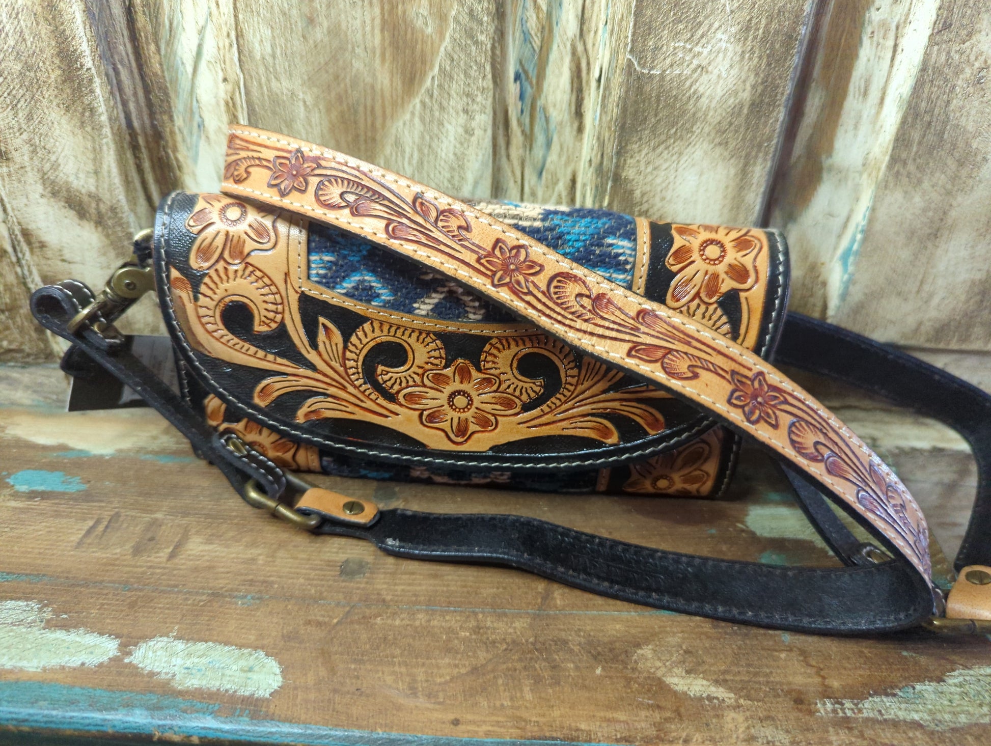 Tooled Leather and Cotton wallet/purse with tooled leather strap. This cute purse opens up to three compartments that include a bill slot, card holders, and a zip top coin pocket. It closes with a flap that is held by a magnetic snap.