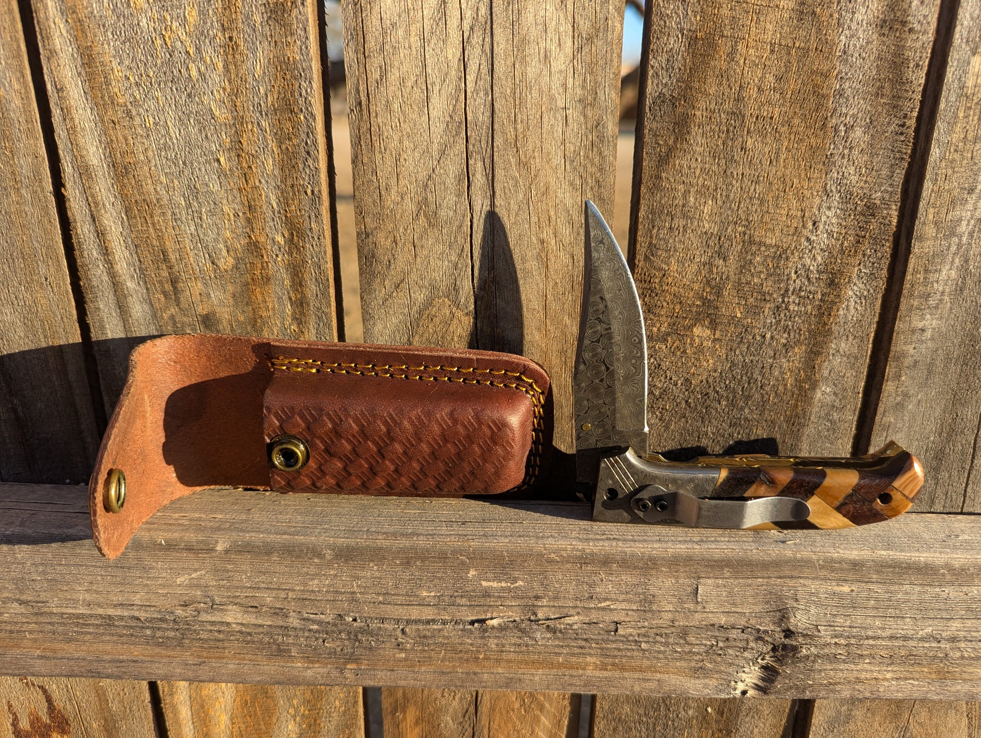 Titan Classico raindrop Damascus Pocket utility knife. 8" long unfolded. 3.5" folding blade. Comes with leather utility sheath.