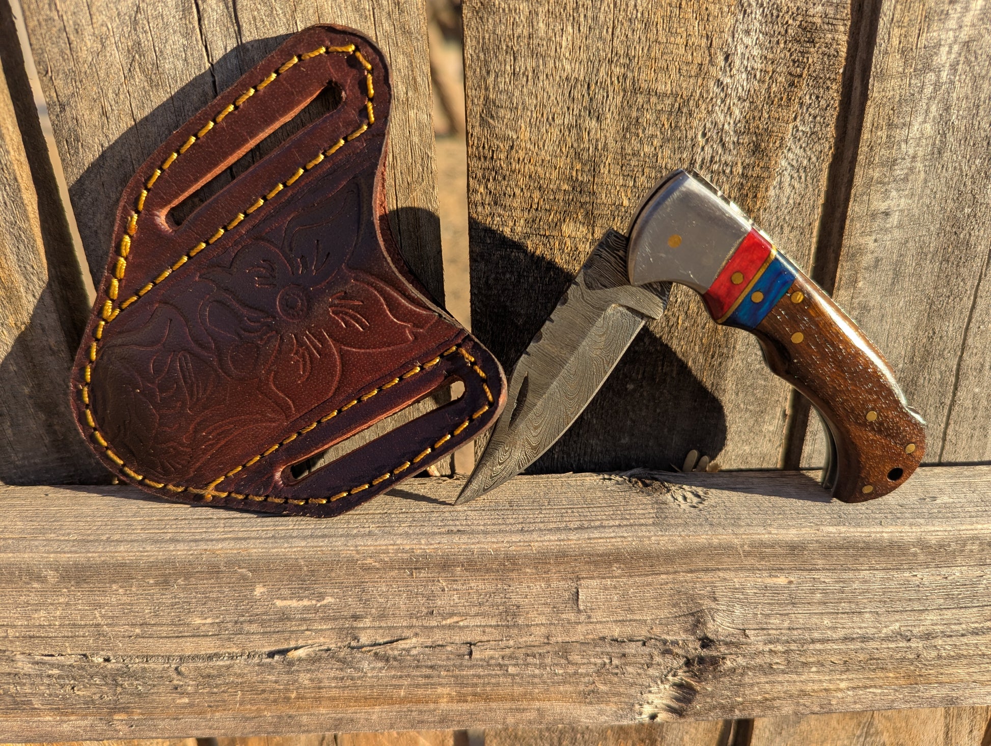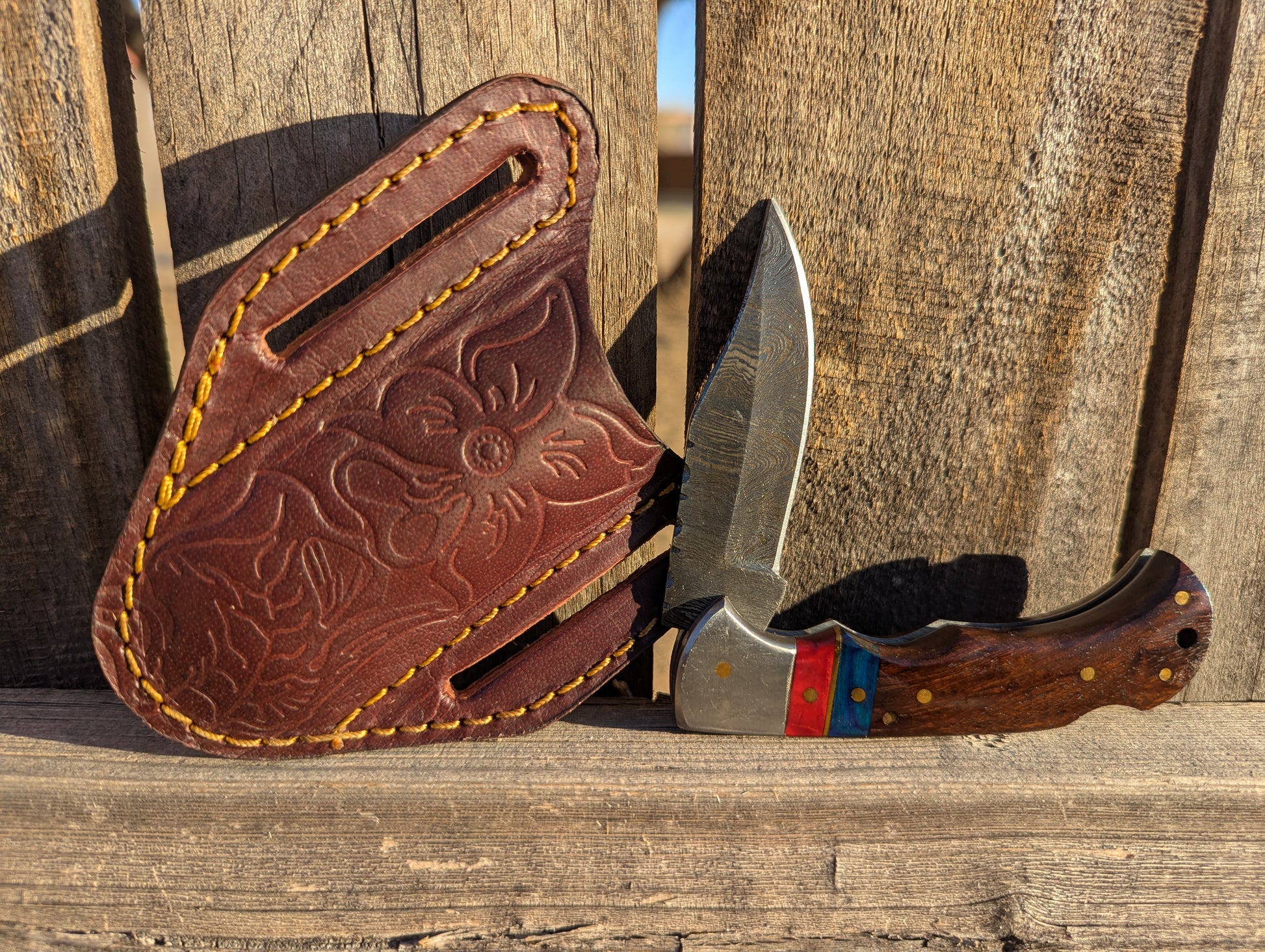 Walnut wood and resin handled Damascus Pocket Knife. 6.5" unfolded. 3" Damascus steel folding blade. Comes with tilted leather sheath.